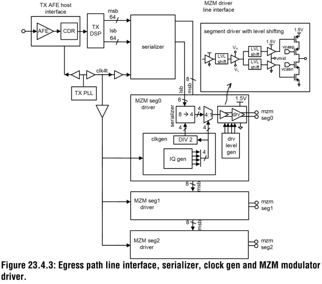 如图23.4.3所示,串行器首先将来自TX DSP的64位重定时并行MSB/LSB数据转换为8位数据流,这些位于8倍时钟(8t)域的数据流被分配至3个驱动器分段——第一个分段分配给LSB,后两个分配给MSB。TXPLL的4倍时钟(4t)沿3个MZM驱动器分段分布,每个分段的本地时钟生成器校正时钟失真,并通过正交时钟生成模块产生4个相位;来自IQgen的校准后8t和4t时钟驱动分段驱动器的最后两级串行器,4:1多路选择器输出经两级电平转换预驱动器转换为1.5V不归零码(NRZ)信号,驱动堆叠输出级的PMOS和NMOS栅极;预驱动器和共源共栅电压电平分别由分段内的电平生成低压差稳压器(LDO)和DAC提供。