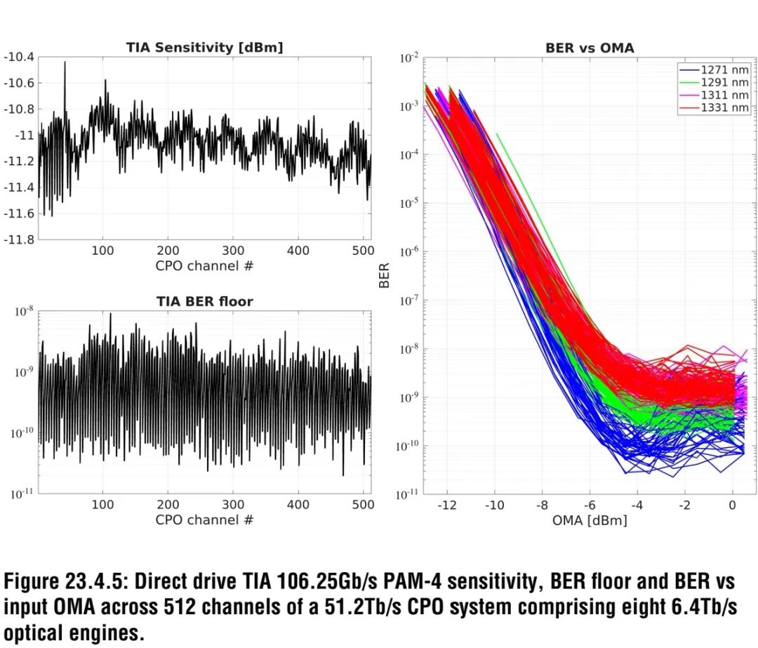接收路径直接驱动TIA的性能测试结果如图23.4.5所示(经host网络ASIC均衡后):在由8个6.4Tb/s光引擎组成的51.2Tb/s CPO系统中,512条通道在4种波长下的测试表明,TIA平均灵敏度优于-11dBm(符合IEEE802.3标准中106.25Gb/s PAM-4的2.4E-4误码率要求),平均误码率下限优于1E-9。106.25Gb/s PAM-4速率下,发射路径的前向纠错(FEC)前误码率优于1E-9,99.98%以上通道无差错。