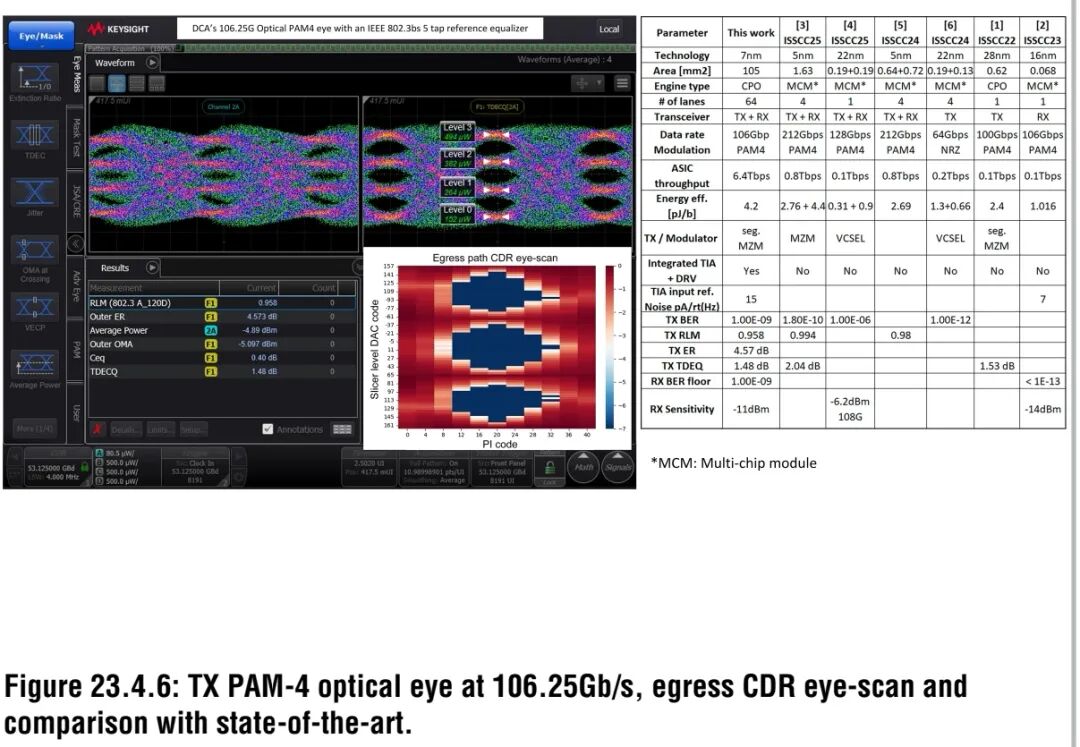 图23.4.6展示了发射路径CDR的眼图扫描结果和PRBS-13码型的PAM-4光眼图(采用IEEE 802.3bs标准接收均衡器及5抽头FFE测量):发射机实现1.48dB的TDEQ、4.57dB的外部消光比(ER)和0.958的RLM。与现有先进光接口收发器的对比表明,该6.4Tb/s CPO ASIC通过64条106.25Gb/s PAM-4通道实现最高集成度和吞吐量,同时保持4.2pJ/b的极具竞争力的能量效率。