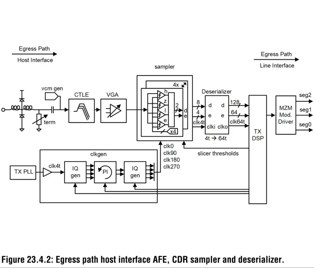 图23.4.2展示了发射路径的主机接口架构:输入信号通过校准终端电容耦合至连续时间线性均衡器(CTLE),该终端采用带宽扩展T型线圈T-coil实现输入静电放电(ESD)保护;CTLE的输入共模电压由可编程DAC设定,其输出驱动可变增益放大器(VGA),进而连接4倍时间交织采样器;CTLE和VGA均采用电阻校准和T型线圈技术扩展带宽。