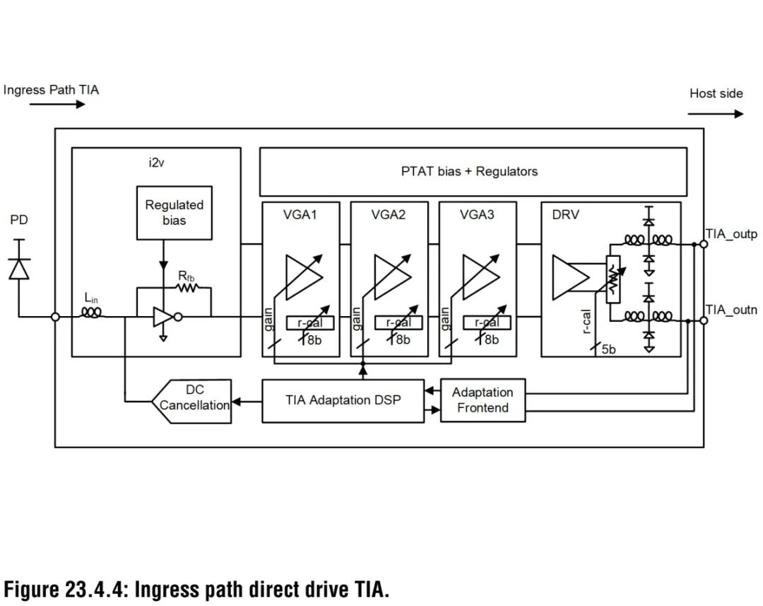 TIA差分输出通过有机基板直接驱动主机交换ASIC,每个通道的TIA由本地DSP实现数字适配——驱动VGA增益控制字以调节幅度,并通过连接至TIA输入的直流抵消DAC补偿直流偏移;适配前端向DSP提供适配信息,每个VGA的增益约为6dB,可编程步长0.2dB。该TIA的标称输入电流噪声密度为15pA/√Hz,功耗低于50mW,且每个TIA通道内部集成本地与绝对温度成正比(PTAT)偏置和电源调节模块。