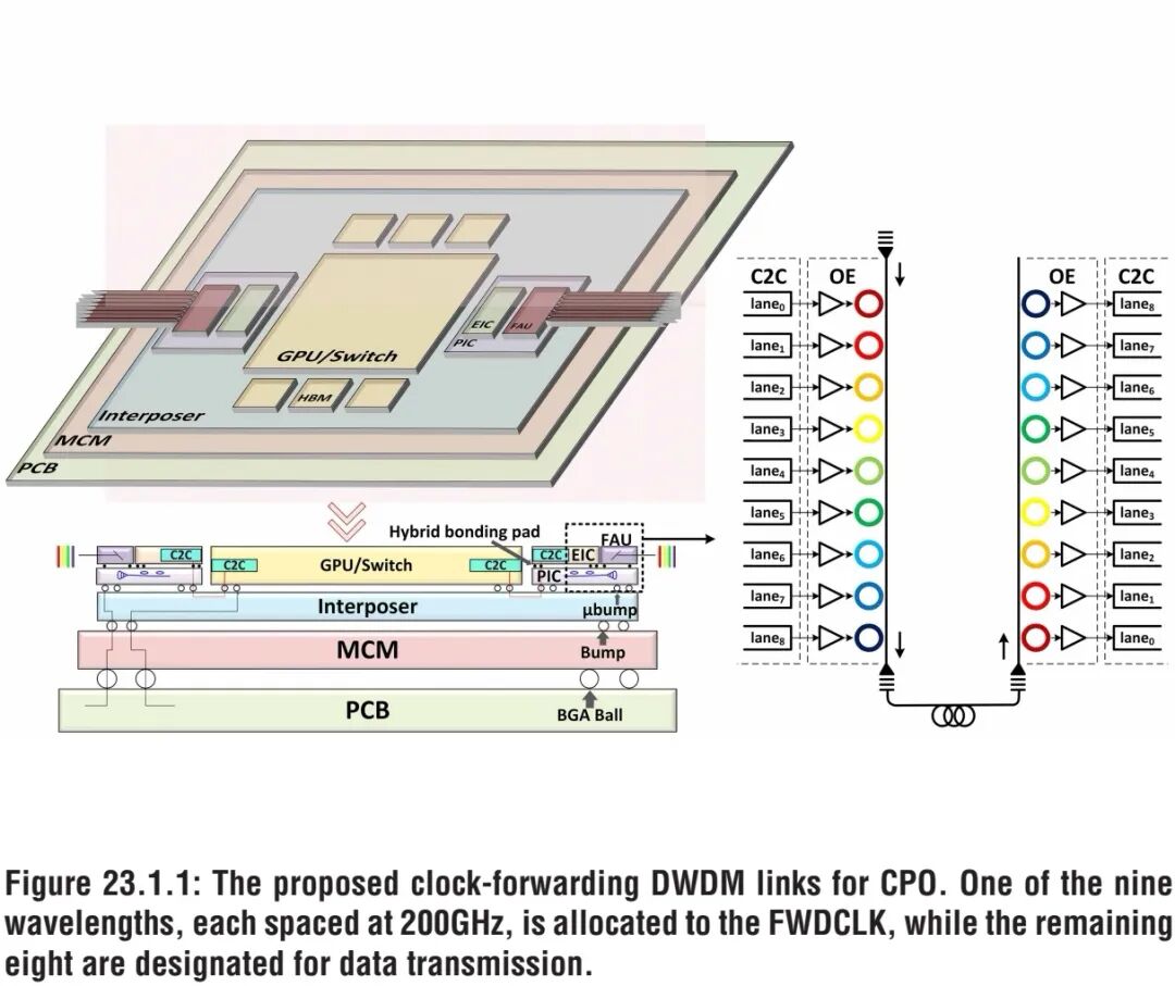 针对上述技术痛点,NVIDIA团队在ISSCC 2026上提出了一款基于3D堆叠工艺的半速率带通滤波时钟转发DWDM光链路,在保留两类时钟方案核心优势的同时,规避了其固有缺陷,实现了高性能、高集成度的光电协同设计。