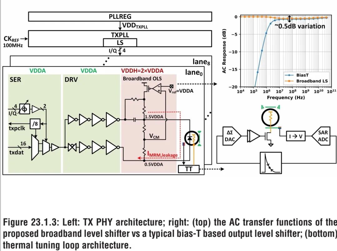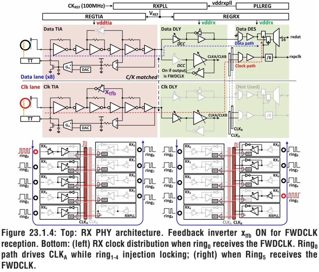 发射机(TX)采用共享时钟架构与全对称通道设计,9个完全一致的TX通道共享同一个基于环形振荡器(RO)的TXPLL,TXPLL部署在稳压电源域中,为所有通道分发4个半速率时钟相位,从源头上保证了多通道时钟的一致性。