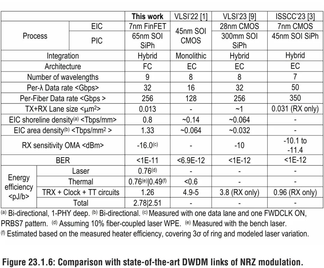 能效与集成密度测试结果显示,在假设光纤耦合激光器壁插效率为10%的前提下,激光器能效为0.76pJ/b,TX与RX微环加热器的能效为0.76pJ/b,TX、RX、时钟分发与热调谐电路的总能效为1.26pJ/b,链路全系统总能效达到2.78pJ/b。集成密度方面,EIC岸线密度达到0.8Tbps/mm,面积密度达到1.33Tbps/mm²,与同期已发表的先进NRZ调制DWDM链路相比,实现了约6倍的岸线密度提升与约20倍的面积密度提升,适配未来AI数据中心CPO应用的高密度集成需求。