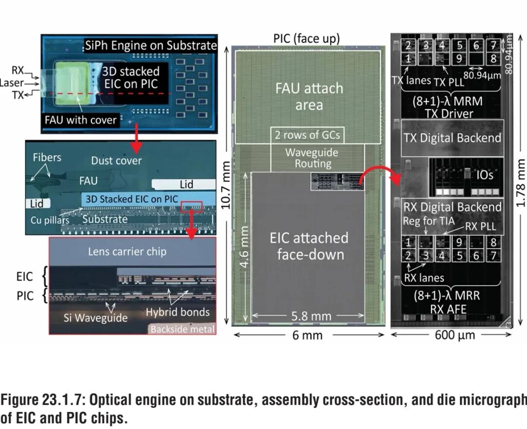 链路采用3D堆叠集成工艺,将7nm FinFET工艺的电子集成电路(EIC)面对面堆叠在65nm SOI硅光子(SiPh)工艺的光子集成电路(PIC)之上,二者通过混合键合技术实现互连,最大限度降低了光电接口的寄生参数,同时提升了接收机的信号灵敏度。