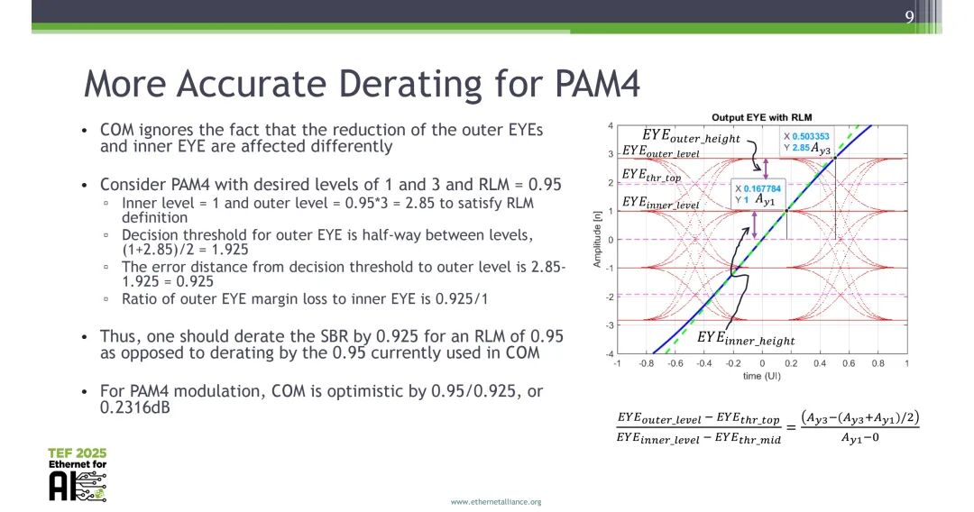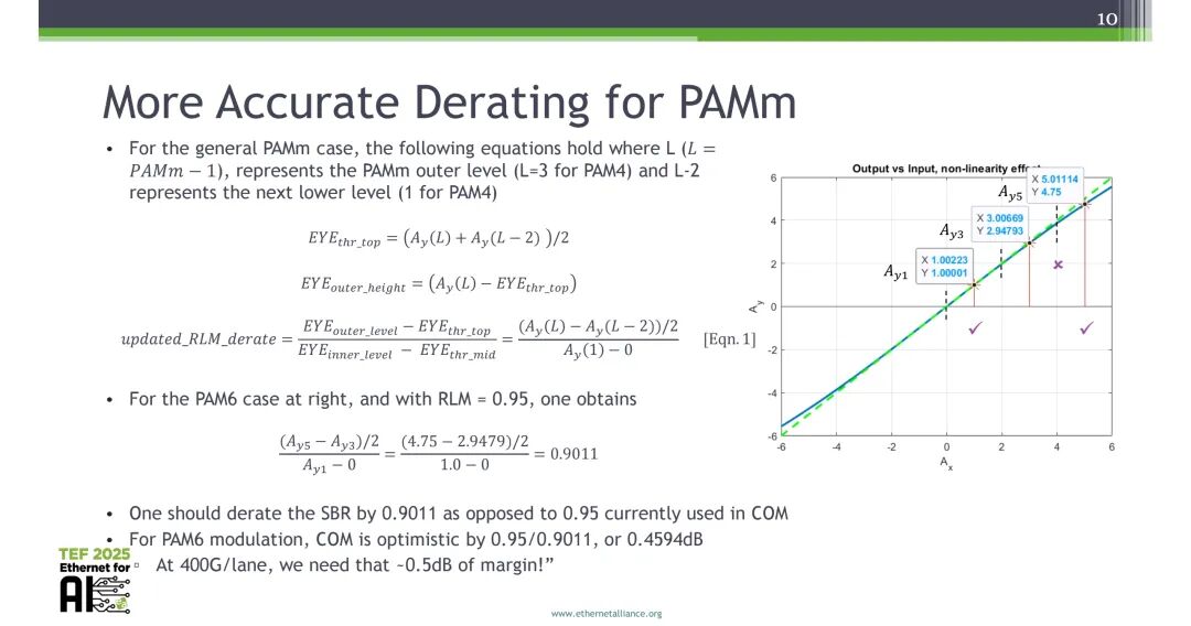 本部分内容由Synopsys首席架构师Ayal Shoval与Fellow John Stonick共同提出,核心针对400Gbps/lane以太网设计中,通道工作裕量(Channel Operating Margin, COM)对电平间隔失配率/线性度(Ratio Level Mismatch, RLM)的敏感性问题,提出了最小可接受线性度修正(derating factor)的方案。