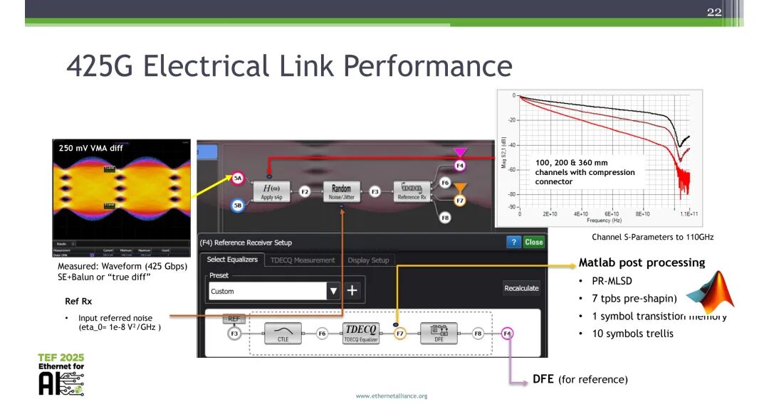 在425G电链路性能测试中,基于100mm、200mm、360mm带压缩连接器的信道,完成了最高110GHz的S参数测量,采用250mV差分VMA、随机噪声/抖动参考接收机,结合PR-MLSD、TDECQ均衡、DFE等技术,完成了425Gbps波形的实测与后处理,验证了链路的传输性能。