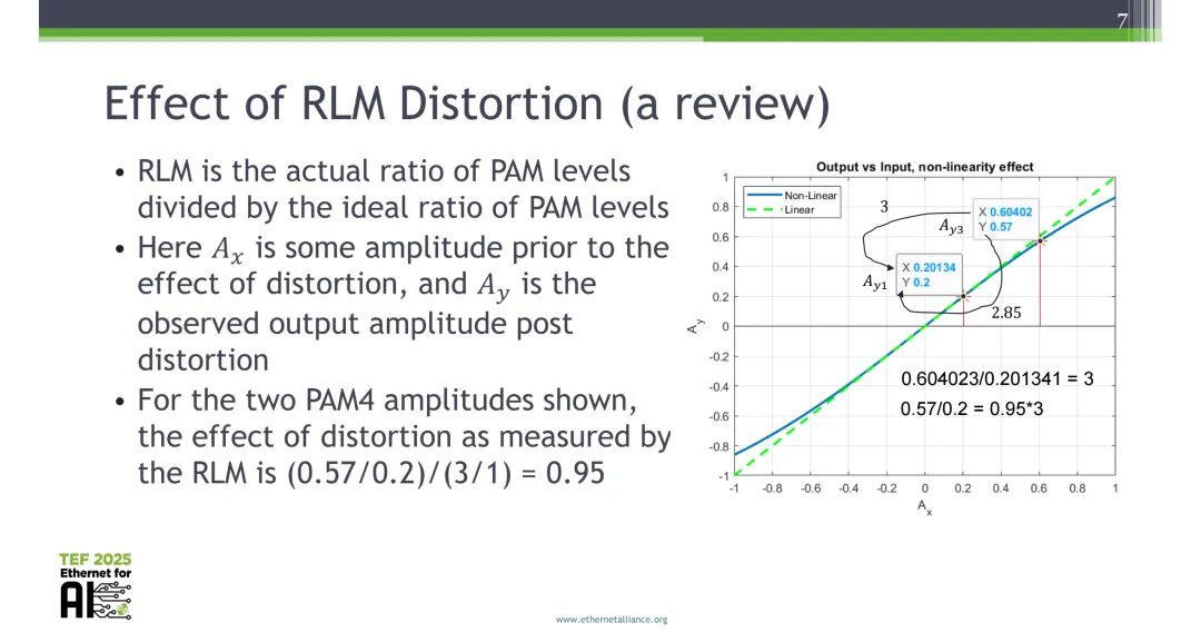 RLM定义为PAM信号的实际电平比与理想电平比的比值,其中A_x为失真前的信号幅度,A_y为失真后的观测输出幅度。以PAM4信号为例,理想内外电平比为3:1,若失真后内外电平比为2.85:1,对应的RLM为0.95。