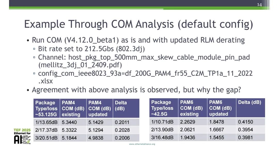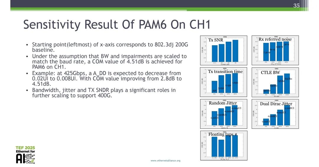 针对CH1信道的PAM6灵敏度分析结果显示,以802.3dj 200G为基线,425Gbps速率下,将A_DD从0.02UI降至0.008UI,COM裕量可从2.8dB提升至4.51dB;带宽、抖动、TX SNDR是支撑速率进一步缩放至400G/lane的核心影响因素,发射机过渡时间、CTLE带宽、接收机参考噪声、均衡器浮动抽头数量也对信道性能有显著影响。