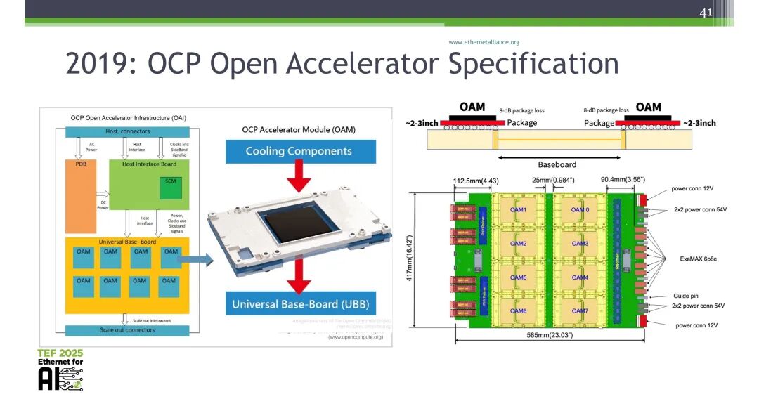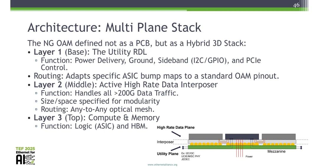 基于OCP开放加速器规范(OAM)的市场基础,提出了下一代OAM(NG OAM)架构,核心是在ASIC/封装边缘定义稳定的IO可组合边界,将互连架构拆分为公用平面(Utility Plane)与数据平面(Data Plane):
