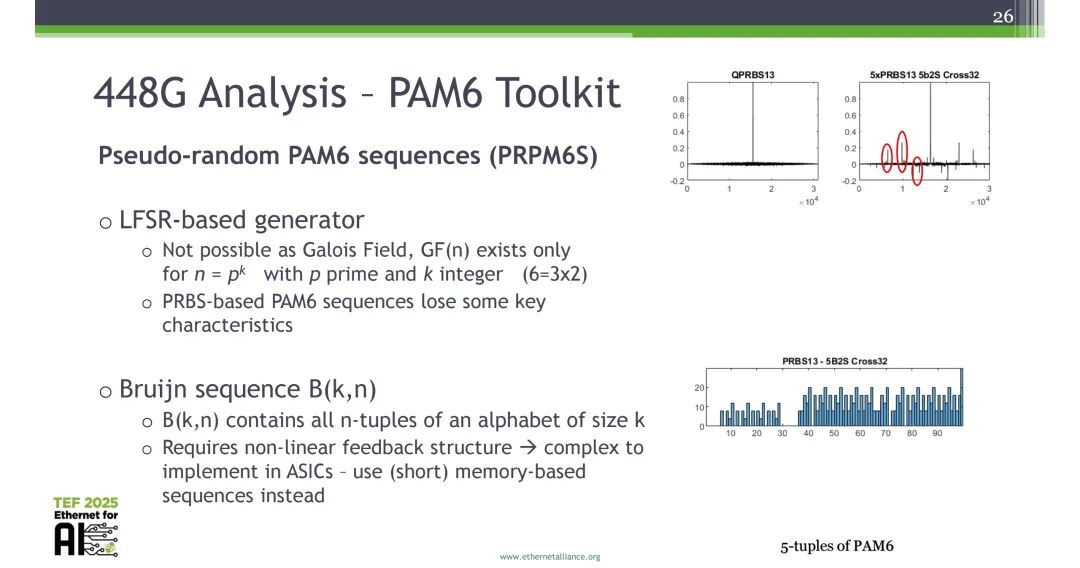 在伪随机PAM6序列(PRPM6S)方面,由于6并非素数的幂,无法基于伽罗华域实现标准LFSR序列生成,PRBS基PAM6序列会丢失部分关键特性;布鲁因序列B(k,n)可包含PAM6字母表的所有n元组,但需要非线性反馈结构,ASIC实现复杂度较高,短期可采用基于短内存的序列方案。