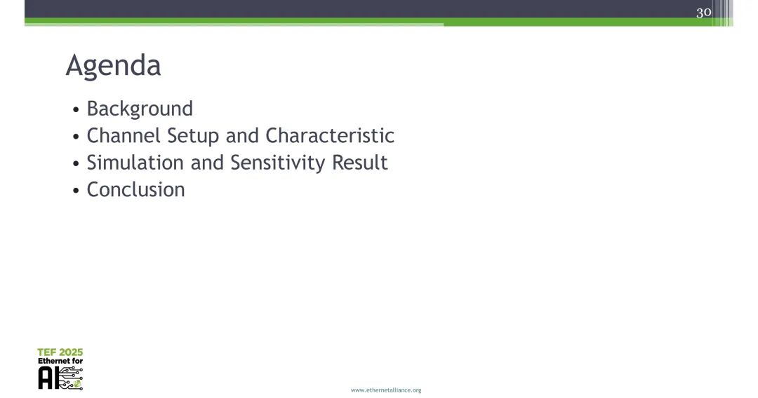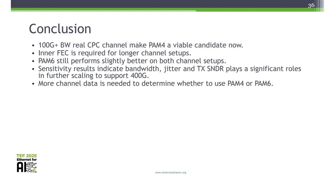最终结论为:100GHz+带宽的真实CPC信道使PAM4成为100GBd+场景的可行候选方案;长信道场景需采用内码增益;PAM6在两款测试信道中均表现出略优的性能;带宽、抖动、TX SNDR是400G/lane速率缩放的核心关键;仍需更多的信道实测数据,以最终确定400G/lane场景的最优调制方案。