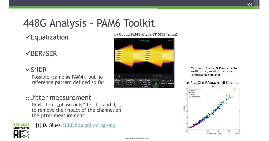 当前PAM6分析工具包已实现均衡、BER/SER、SNDR等核心测量功能,与PAM4的测量能力对齐,但仍存在两项标准化缺口:一是抖动测量缺乏统一方法,需采用“仅相位”方案测量Jnu与Jrms,以消除信道对抖动测量结果的影响;二是行业尚未达成统一的PAM6编码方案与测试图案标准。