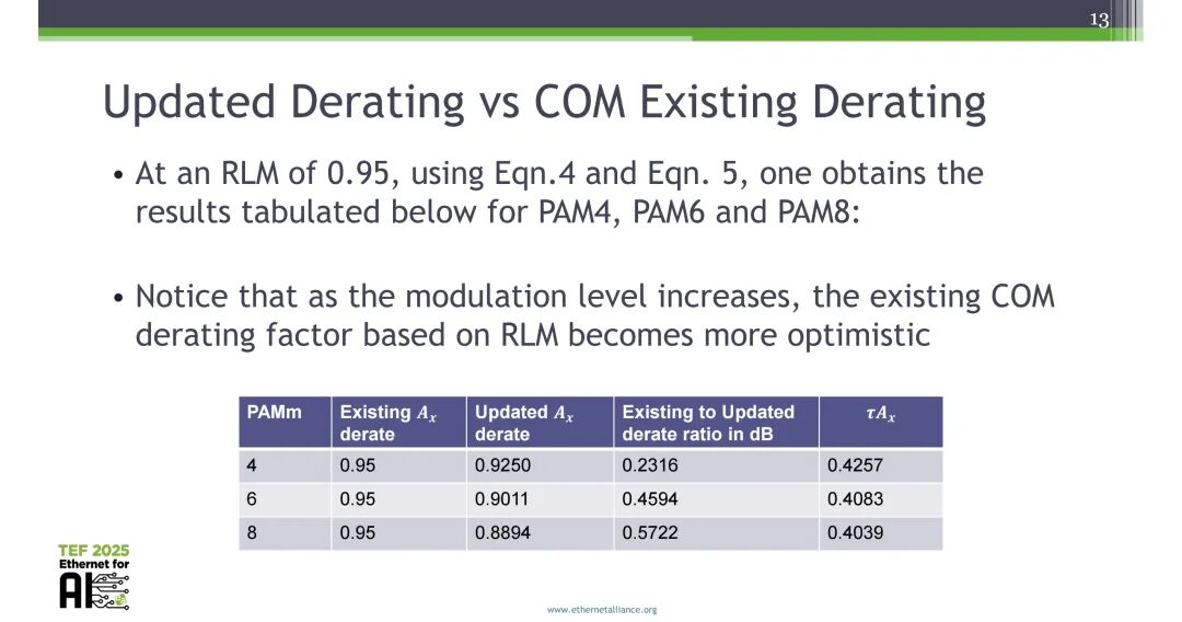 以RLM=0.95的PAM6信号为例,计算得到更新后的降额因子为0.9011,而非现有COM采用的0.95,现有方案对PAM6的裕量多计算了0.4594dB,而这部分约0.5dB的裕量对400G/lane设计至关重要。