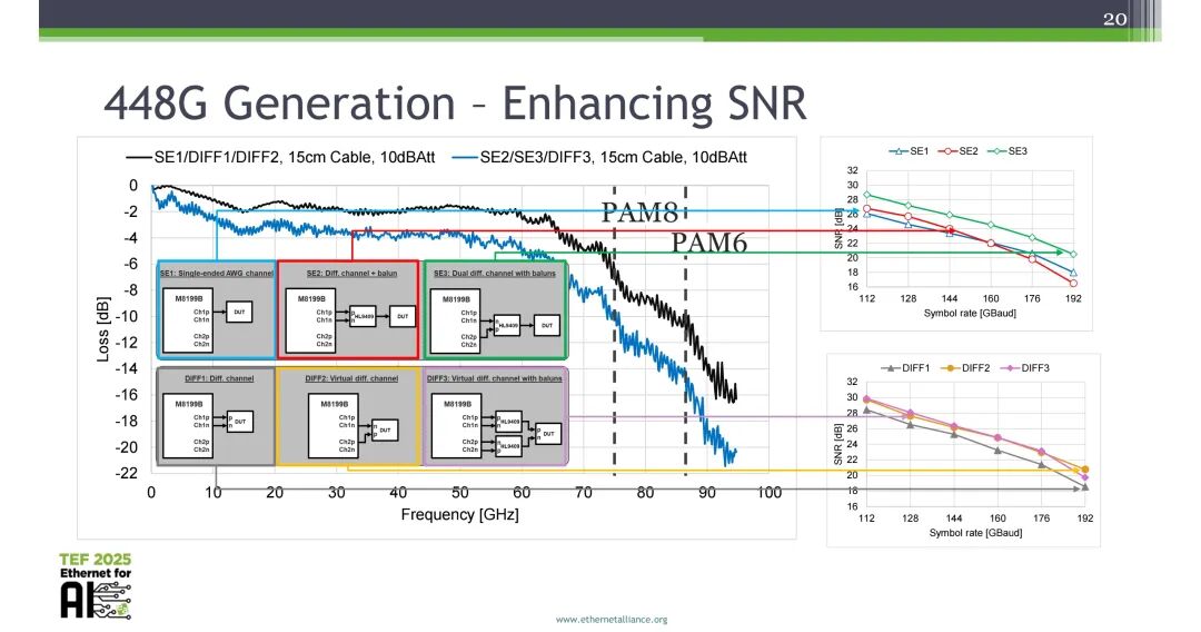 当前测试测量方案已可支撑448G信号的路径探索,核心围绕SNR提升开展优化。对比单端信道、差分+巴伦信道、双差分+巴伦信道三种方案,双差分+巴伦的SE3方案可实现最优的SNR性能,在相同符号率下,相比单端方案可实现显著的SNR提升。