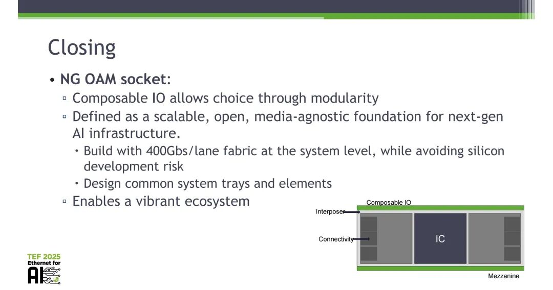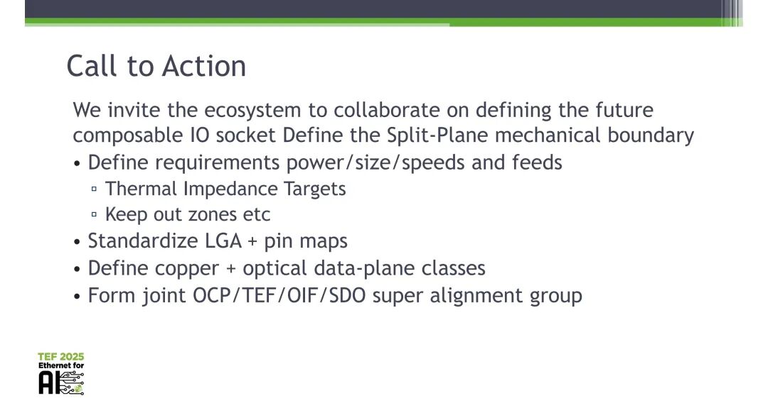 最终发出行业倡议,邀请生态伙伴协作完成以下工作:共同定义未来可组合IO插座,明确分平面机械边界;定义电源、尺寸、速率、热阻抗目标、禁布区等核心需求;标准化LGA与引脚图;定义铜与光数据平面的等级分类;成立OCP/TEF/OIF/SDO联合对齐小组,推动400Gb/s/lane架构在AI系统中的规模化落地。