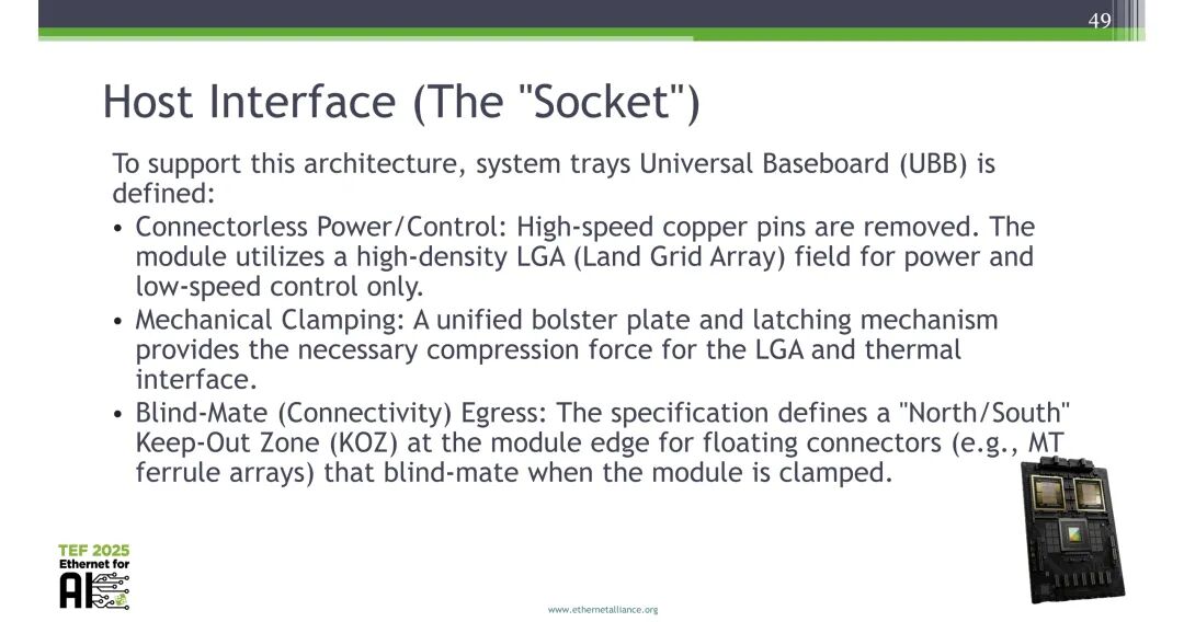 为支撑NG OAM架构,系统托盘的通用底板(UBB)采用三项核心设计:一是无连接器的电源/控制设计,移除高速铜引脚,仅通过高密度LGA阵列实现电源与低速控制信号的传输;二是统一的机械夹紧设计,通过统一的支撑板与锁存机制为LGA与热界面提供所需的压缩力;三是盲配出口设计,在模块边缘定义南北向禁布区(KOZ),用于安装浮动连接器,实现模块夹紧时的盲配对接。