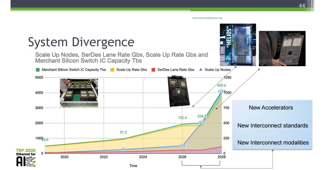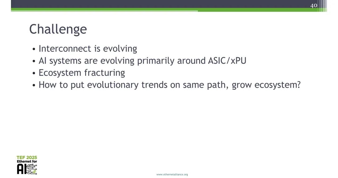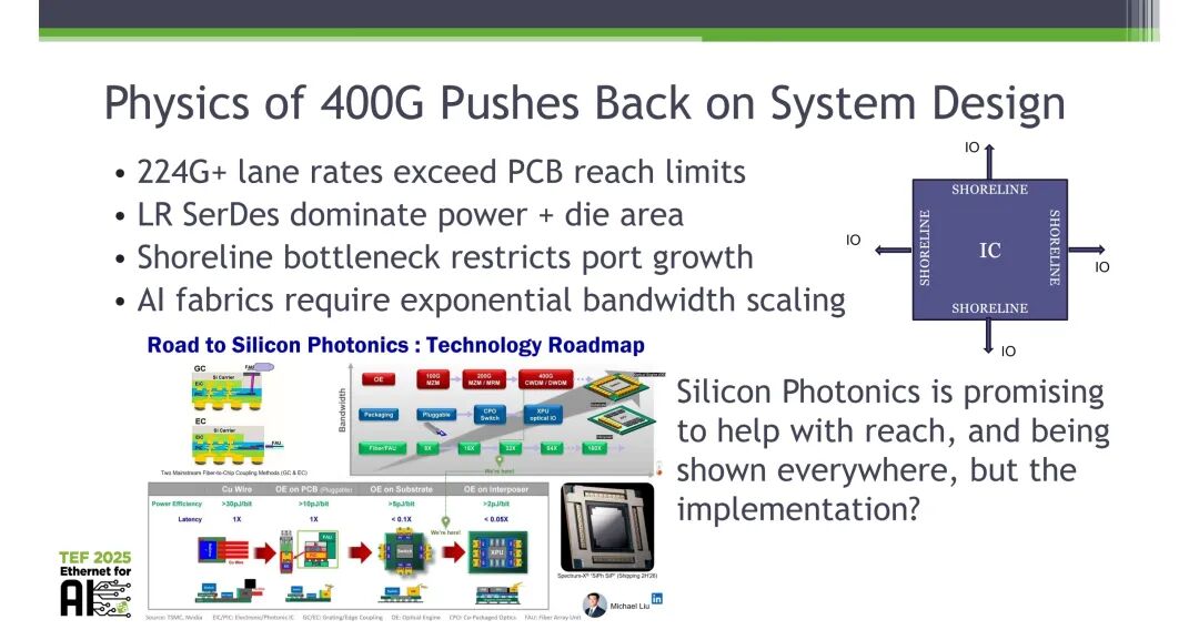 400G/lane的物理特性对AI系统设计带来了多重核心挑战:224G+/lane速率已超出PCB的传输距离极限;长距离(Long-Reach, LR)SerDes占据了芯片的主要功耗与裸片面积;岸线瓶颈限制了端口数量的扩展;而AI计算架构对带宽的需求呈指数级增长。硅光技术虽可解决传输距离问题,但其实现方案尚未形成统一标准,同时互连技术与AI ASIC/xPU的演化路径不一致,导致行业生态碎片化,成为400G/lane技术规模化落地的核心障碍。
