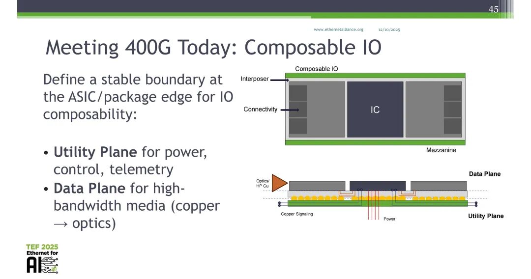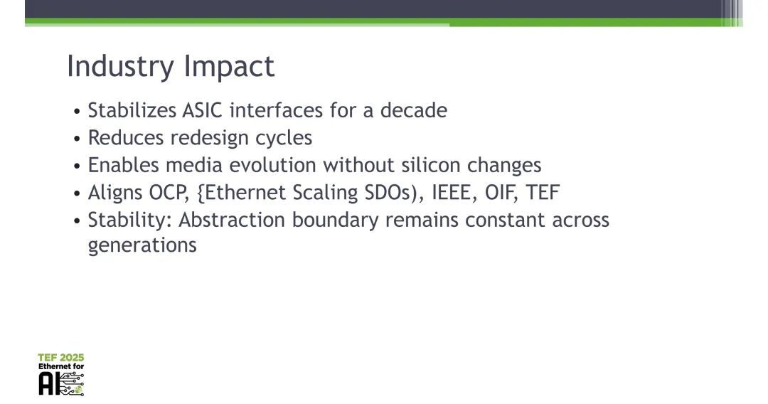 该可组合IO架构可将ASIC接口的稳定周期延长至十年,减少芯片的重新设计周期,实现媒体技术演进与硅片设计的解耦,同时可对齐OCP、以太网缩放SDO、IEEE、OIF、TEF等行业组织的技术路线,解决生态碎片化问题。