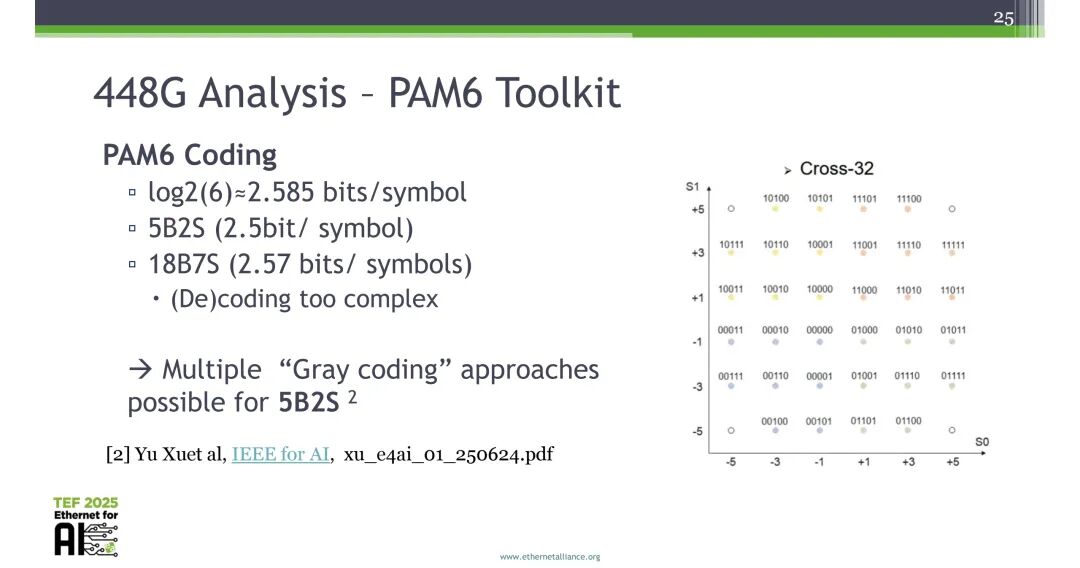 在PAM6编码方面,PAM6可实现约2.585bit/符号的传输效率,主流候选方案为5B2S(2.5bit/符号)与18B7S(2.57bit/符号),其中18B7S编解码复杂度较高,5B2S可适配多种格雷编码方案。