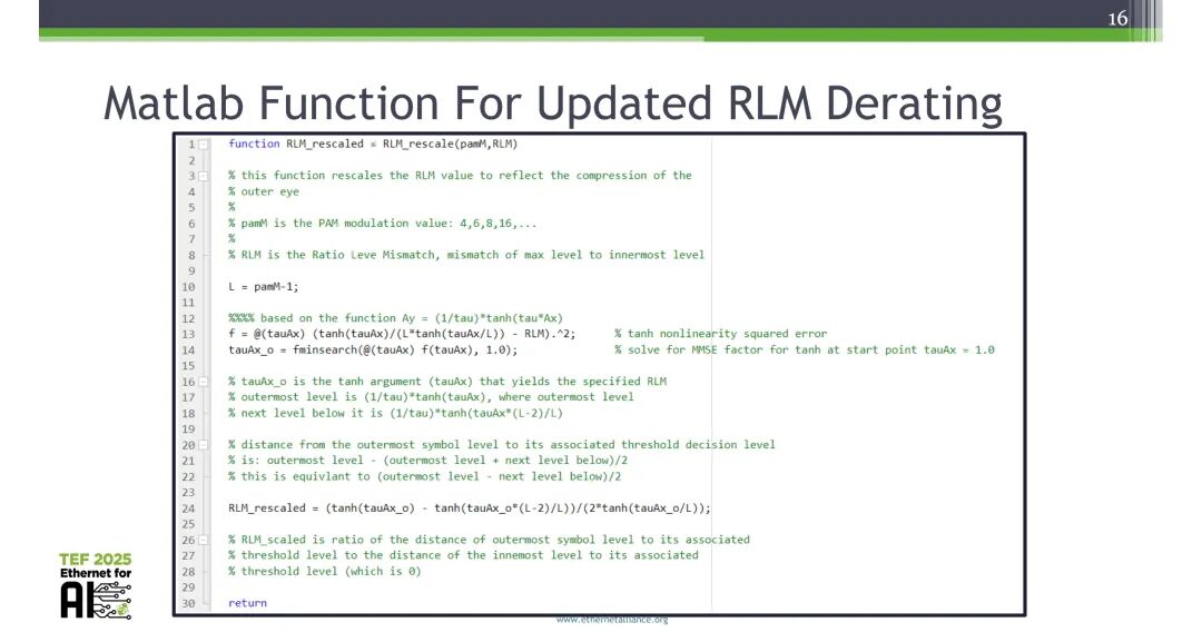 同时提供了更新后RLM降额的Matlab实现函数,输入为PAM调制阶数pamM与RLM数值,输出为修正后的最小可接受线性度,核心逻辑为通过fminsearch求解tanh模型的最优τ A_x,再代入通用降额公式完成计算。