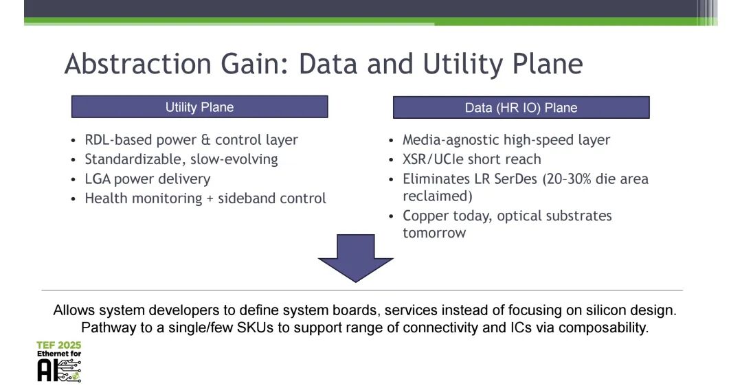 - 数据平面:负责高带宽媒体传输,支持从铜到光的平滑演进,采用XSR/UCIe/VSR短距离技术,可摒弃LR SerDes,回收20-30%的芯片裸片面积,为媒体无关的高速传输层。