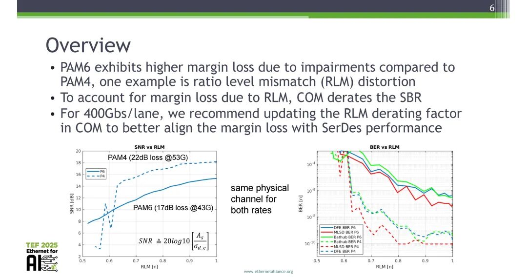PAM6调制相比PAM4,在相同物理信道下受链路损伤影响会产生更高的裕量损失,RLM失真是核心影响因素之一。当前COM模型通过对单比特响应SBR进行降额来计入RLM的影响,但该方式与实际SerDes性能的匹配度不足,针对400Gbps/lane场景,需更新COM中的最小可接受线性度,以更精准地匹配RLM带来的裕量损失。