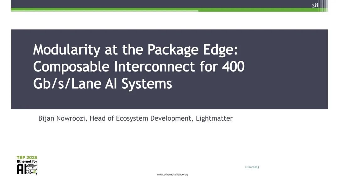 本部分内容由Lightmatter生态发展负责人Bijan Nowroozi提出,核心针对400G/lane速率下的系统设计瓶颈,提出了封装边缘的可组合互连架构,为AI系统的指数级带宽缩放提供了标准化的架构方案。