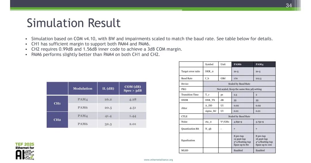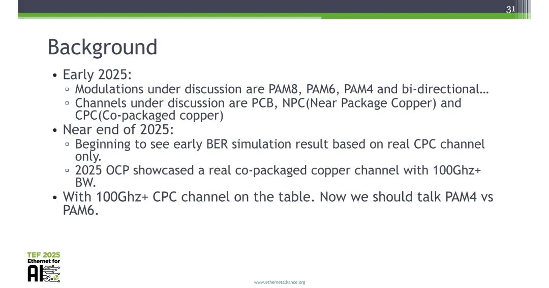 2025年初,行业针对AI网络互连的主流调制方案包括PAM8、PAM6、PAM4与双向调制,主流信道包括PCB、近封装铜(Near Package Copper, NPC)与CPC;2025年末,行业已出现基于真实CPC信道的BER仿真结果,2025 OCP展会也展示了100GHz+带宽的真实CPC信道,基于此,100GBd+速率下PAM4与PAM6的性能对比成为核心议题。