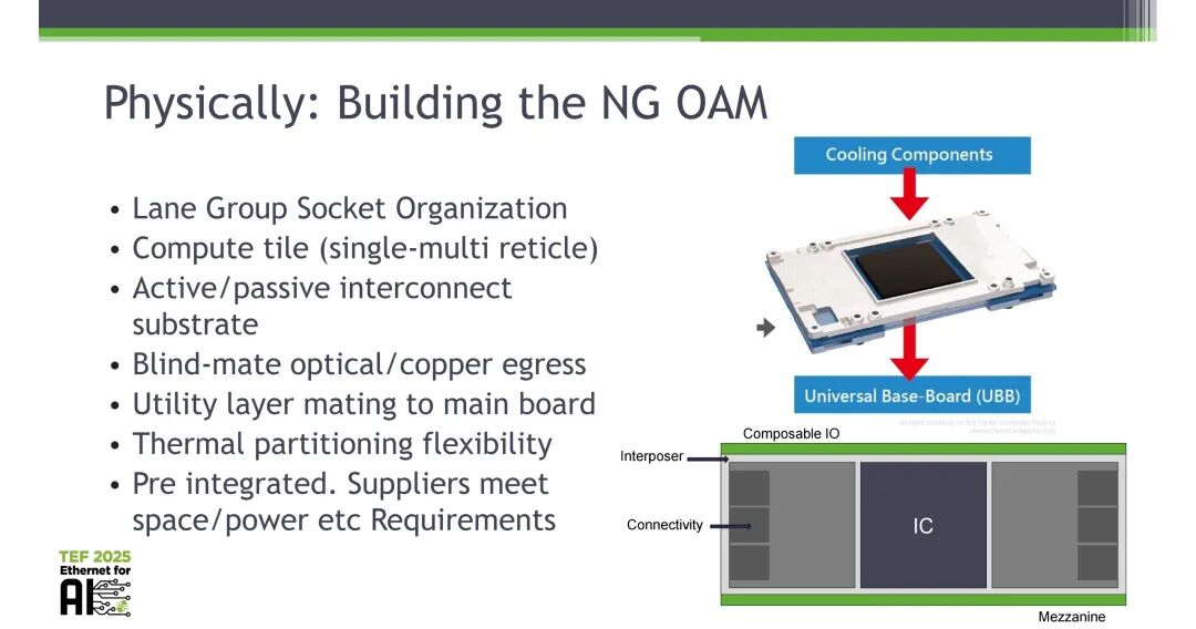 在物理实现上,NG OAM采用多通道socket插座结构(Lane group socket)、计算tile布局、有源/无源互连衬底、盲配光/铜出口、公用层与主板对接、热分区灵活设计,所有组件均为预集成,供应商需满足统一的空间、功耗等规格要求。