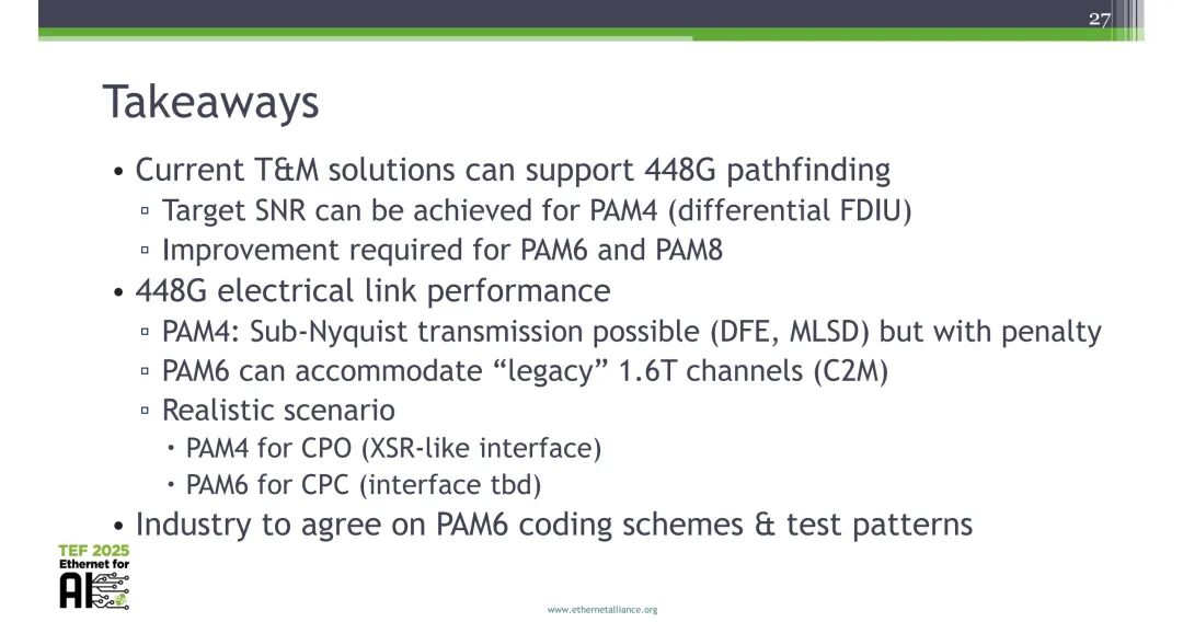 当前测试测量方案可支撑448G技术的路径探索,差分FDIU系统可实现PAM4的目标SNR,PAM6与PAM8仍需进一步提升SNR性能;448G电链路中,PAM4可适配CPO场景的XSR类接口,PAM6可兼容CPC接口与传统1.6T C2M信道;行业需尽快达成PAM6编码方案与测试图案的统一标准,以推进标准化进程。
