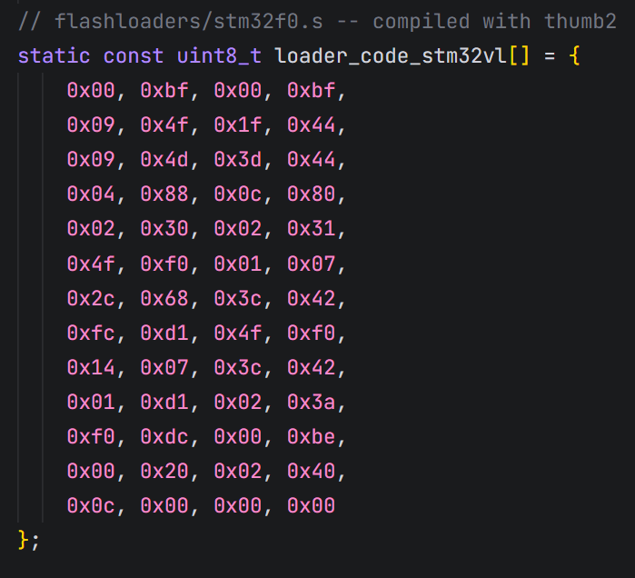 这些其实是汇编代码编译后的机器码 ! 它们对应的源文件在 flashloaders/ 目录下(如 stm32f0.s );这些机器码就是那个“搬运工程序”;不同的芯片(STM32F0, F4, L4, WB 等)Flash 控制器的操作方式不同,所以需要不同的搬运工。