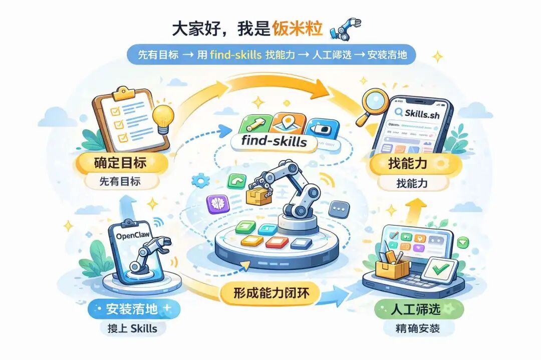 先有目标 → 用 find-skills 找能力 → 人工筛选 → 安装落地。