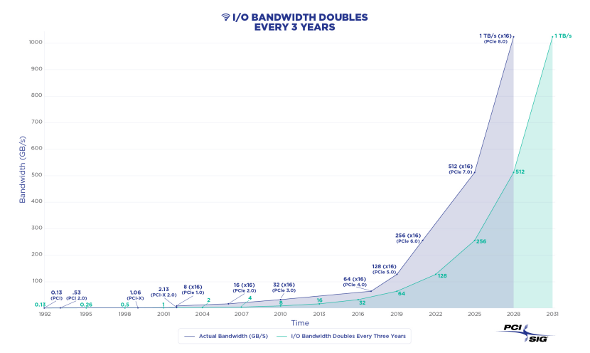 二十多年来,PCIe规范一直保持着约三年迭代一次的节奏,与处理器、显卡、存储的产品周期对齐,以维持算力增长与数据供给之间平衡。2025年PCIe已经迭代到了7.0版本,2028年将发布8.0版本。