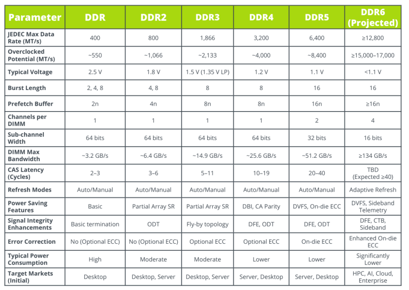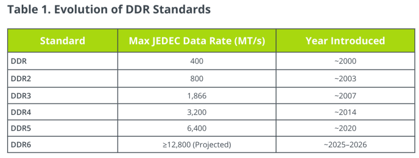 DDR系列标准演进如下图所示,迭代遵循稳定节奏,每约5年更新一代,且新一代产品的最大数据传输速率通常翻倍。最新一代DDR6正在开发中,预计近期将会发布。