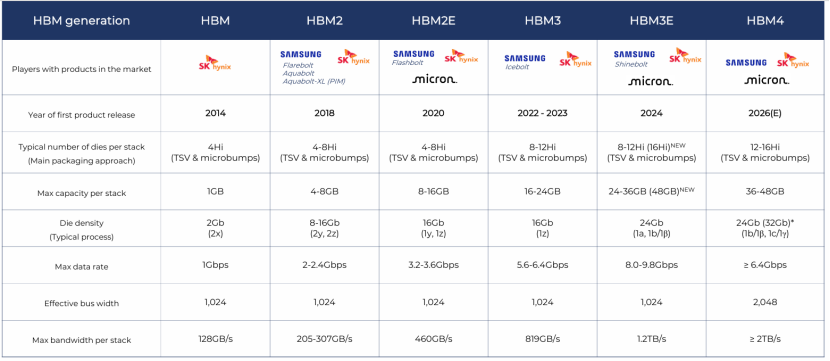HBM系列标准演进如下图所示,目前最新的是HBM4。HBM5在开发中,JEDEC预计2027 年发布,目标带宽达4TB/s,采用32层堆叠,工作电压降至 0.8V,能效比再提升40%。