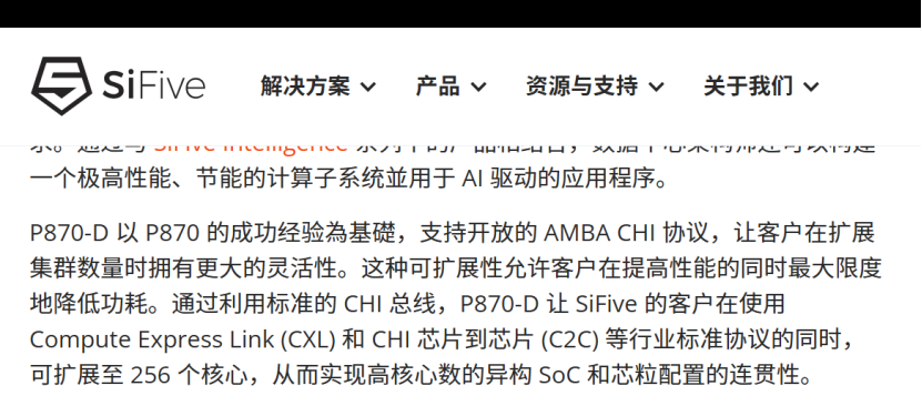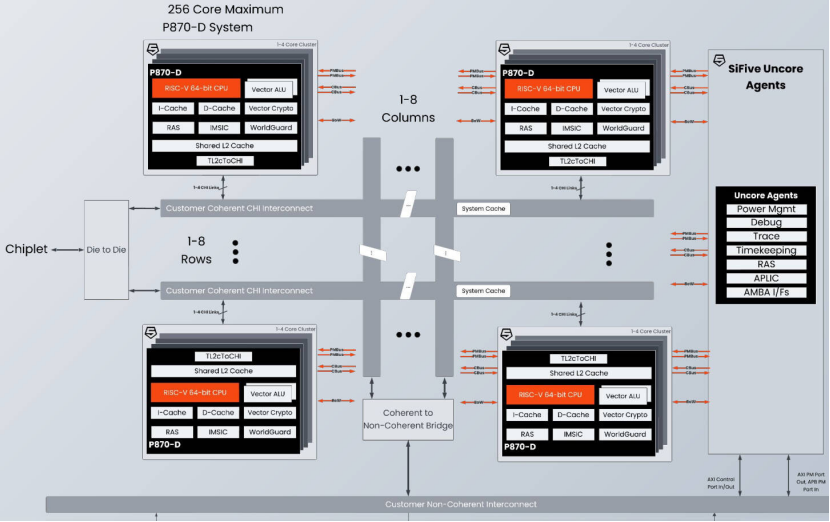 SiFive P870-D是SiFive公司研发的RISC-V数据中心级高性能芯片。从下面两个材料来看,它应该是可以做到使用CHI C2C 扩展模式直接连接外部芯片,比如另一颗 P870-D 处理器,实现多芯片间的缓存一致性通信的。