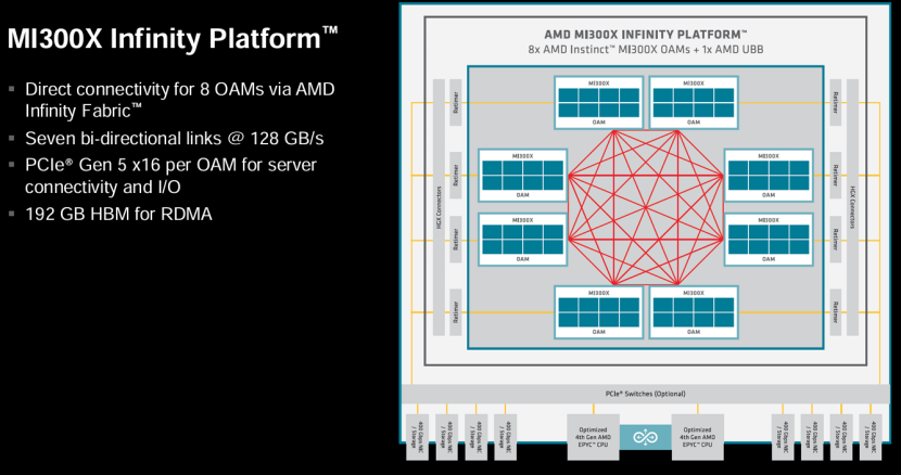 图中每块MI300X配备了7条双向链路,单链路带宽达128GB/s(双向),保障任意两块 GPU 间的无阻塞通信。