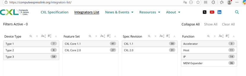 不过这两类设备,商业上还不成熟,我们可以参考下CXL网站上的integrators-list,就可以感受到了。下图中Type1和Type2加起来只有Type3的1/4。