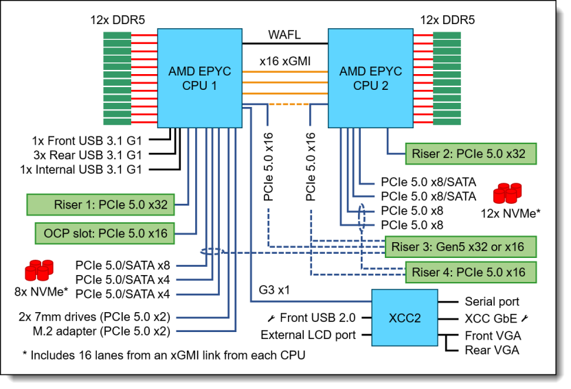 和Intel UPI支持2-8路扩展不同,xGMI专注双路优化,通过点对点直连架构实现极致性能。现在xGMI单通道可达32 GT/s的速率,两颗CPU可以通过多条xGMI链路同时相连,取得更巨大的聚合带宽。