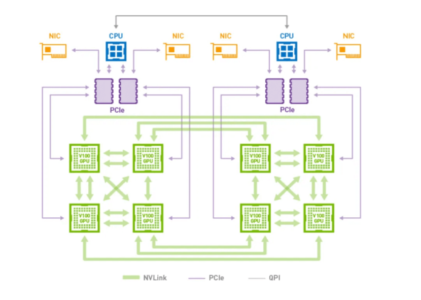 NVLink 是一种点对点高速串行链路,从物理层就针对 GPU-GPU和GPU-CPU通信进行了优化设计,其单链路带宽远高于同期PCIe。