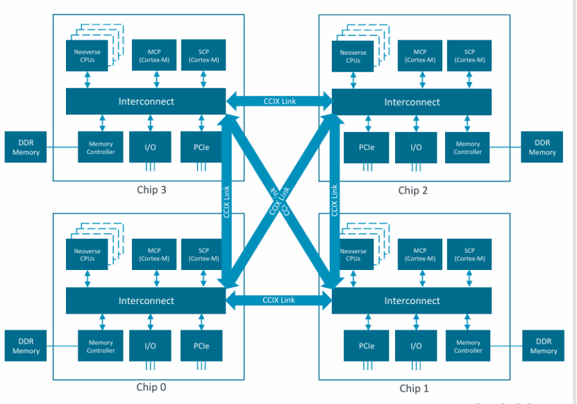 ARM在2017年,使用过CCIX作为Neoverse N1/V1平台的双路/四路扩展的片间协议。