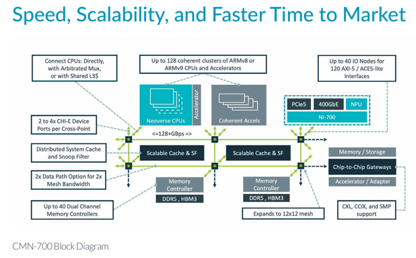 后面到了21年,ARM发布了CMN-700技术,这是 Arm 首款支持芯粒 (Chiplet) 与多插槽互联的 Mesh 网络技术,它兼容 CCIX/CXL 2.0协议,能实现芯粒间、芯片间缓存一致性互联。