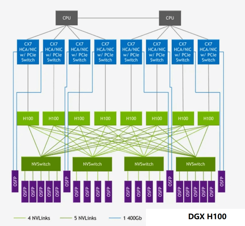 早期GPU间通过有限的NVLink链路直连,形成如“超立方体”的拓扑。这优化了邻近GPU的通信,但距离远的GPU仍需中转。