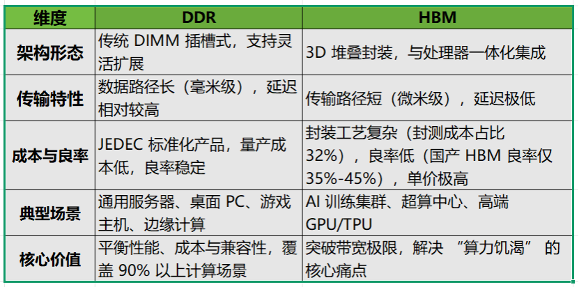 如下图所示,HBM和DDR不是替代关系,而是场景互补关系。DDR面向通用计算场景,HBM则面向的是AI 训练、超算、高端GPU等高端算力场景。