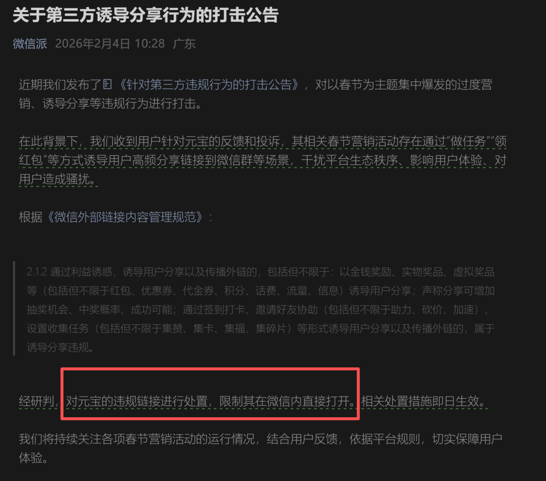 我上篇发布的中国AI的“斩杀线”一文预言阿里会下场,果不其然,阿里豪掷30亿参与战争。同时,在被元宝红包病毒攻占3天后,微信官方终于出手,限制了元宝红包链接。