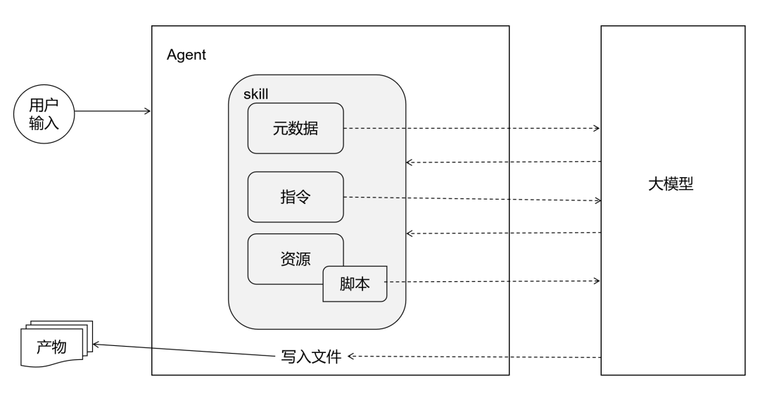 当我们向Agent发出一个需求的时候,Agent会把你的需求和Skills的简介列表丢给大模型,大模型找出你的需求可以用哪些Skills来完成,并告诉Agent,Agent就进一步读取这个Skill的详细描述。随后,Agent根据Skill所提供的资料,把重要的信息,作为prompt,与当前要完成的目标相关的提示词一并发给大模型,大模型在思考后,告诉Agent,你现在需要做什么事情,这些事是基于Skill描述中提到的,包括但不限于读取文件、按照要求写代码、调用mcp、执行脚本等等。Agent在接收到大模型的指令后,就去执行这些动作。在部分情况下,大模型认为,Agent提供的信息不足以支撑它返回准确的指令,就会告诉Agent,“你再提供更多信息给我吧”,Agent在接收到大模型的要求后,会进一步按照大模型提供的信息,去Skill里面找必要的资料,再提交给大模型。