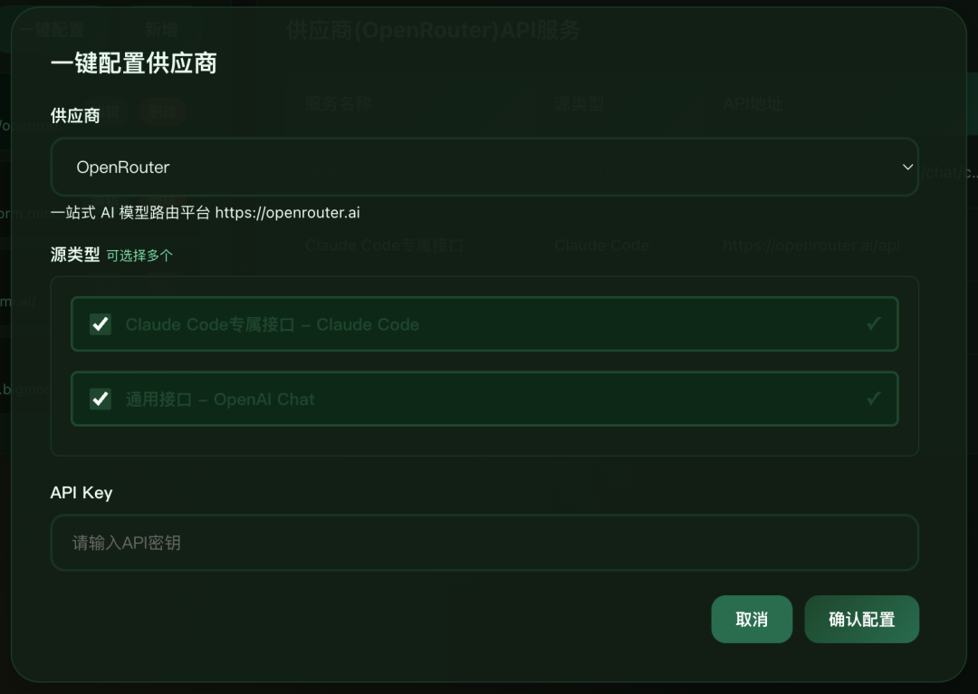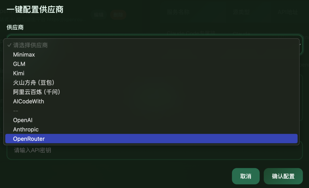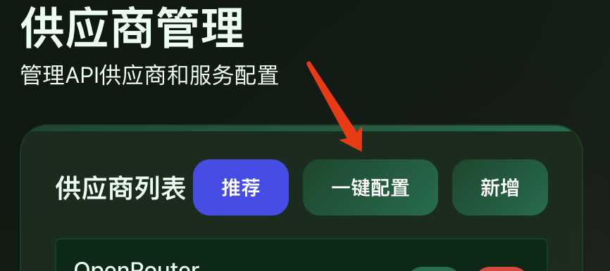 aicos ui此时,你可以得到一个管理UI界面,你需要创建一个供应商,在供应商页面,点击“一键配置”按钮,并选择OpenRouter。