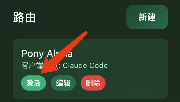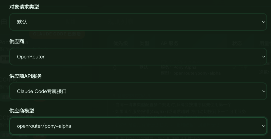 接着,在路由右侧,点击新建规则。选择“OpenRouter”作为供应商,点击我们刚才在供应商管理页面填写的API服务“Claude Code专属接口”,然后再选择 openrouter/pony-alpha。