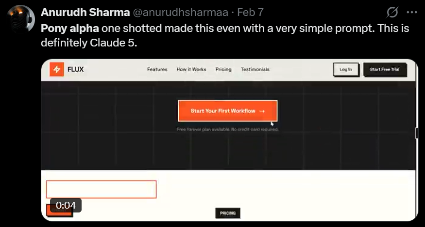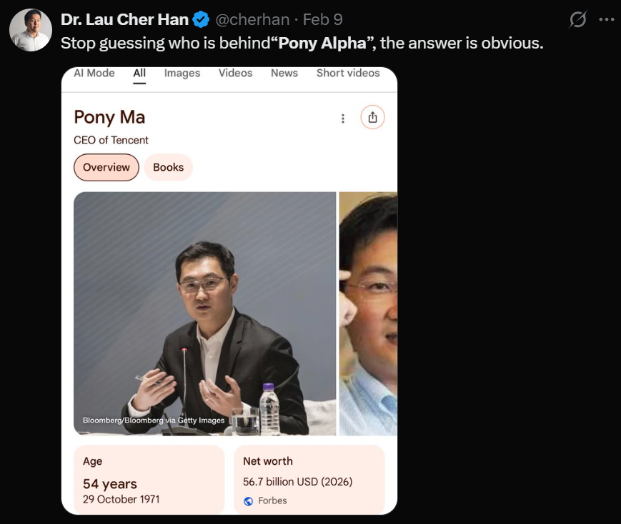 有人说它是Claude的下代模型(Sonnet5),因为它的很多行为与Claude相似,也有人说它可能是腾讯的新模型,因为Pony是腾讯创始人的英文称呼,另外也有人说这可能是将要发布的新Grok模型,因为它的角色扮演能力很强,总之众说纷纭。当然,作为中国用户,更倾向于它是国产模型,因为pony和马年联系也很紧密,deepseek v4和glm-5的呼声非常高。